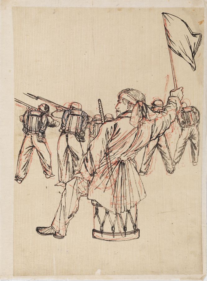 Tsukioka Yoshitoshi (1839-1892)- An original preparatory drawing of Otori Teinosuke Seated on a Drum together with the published print. From the series Keisei Suikoden (Biographies of Valiant Drunken Tigers). 1872.