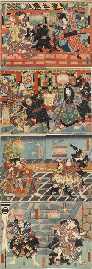1849. Chuban triptych. Fine impression with extensive metallic printing and embossing. Very good colour and condition. Album backing.