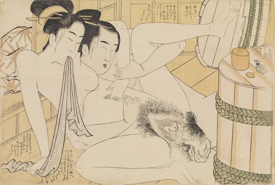 Torii Kiyonaga (1752-1815)- A Woman Masturbating with a Sex Toy. From the series Koshoku Suetsumuhana (Erotic Suetsumuhana). Circa mid-1780's.