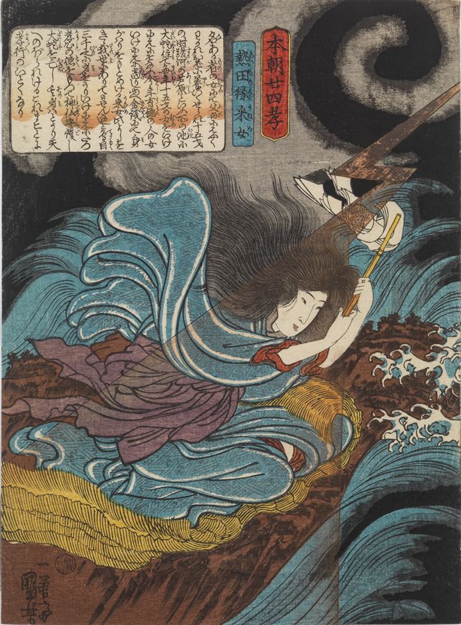 Utagawa Kuniyoshi (1797-1861)- Uneme of Atsuta Exorcizing a Monstrous Serpent from a Lake. From the series Honcho nijushi ko (Twenty-four Japanese Paragons of Filial Piety).