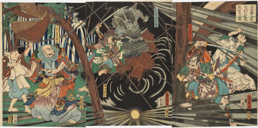 Oban triptych. 35.5 x 76 cm. Fine impression and colour. Very good condition. A fine, early design by the artist showing the strong influence of Kuniyoshi who made a triptych of the same subject with the ghost of Akugenda Yoshihira striking down Nanba Jiro.