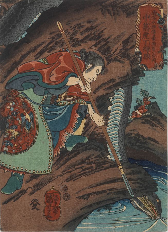Utagawa Kuniyoshi (1797-1861)- Ding Desun (Chusenko Tei Tokuson) Attacking a Huge Snake with His Spear. From the series Tzuzoku Suikoden goketsu hyakuhachinin no uchi (108 Heroes of the Popular Water Margin). Circa 1845-52