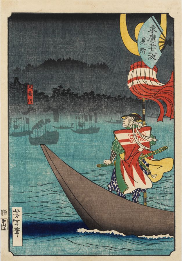 Tsukioka Yoshitoshi (1839-1892)- A Fleet of Warriors at Mitsuke. From the series Suehiro gojusantsugi (The Fifty-three Stations of the Tokaido Road with Cartouches in the Shape of Fans). 1865