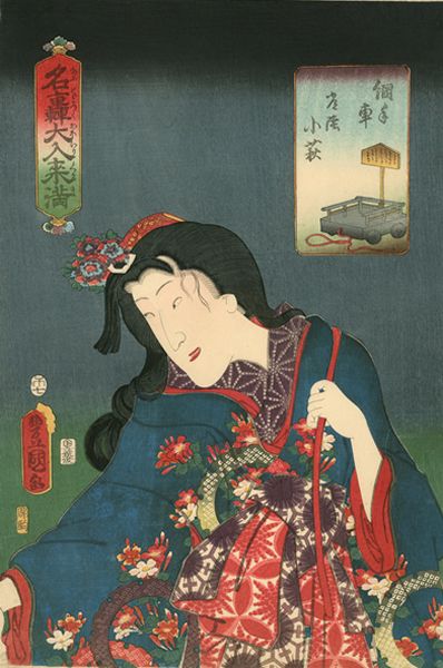 Onoe Kikujiro II as Hitachi Kohagi Pulling a Small Cart with a Rope. Tsunada Kuruma-Hitachi Kohagi(The Rope-pulled Cart—Kohagi of Hitachi). From the series Na o Todoroku O-iri Kuruma (Famous and Succesful Carriages). 1858. Oban. Fine, early impression on deluxe paper. Fine colour and condition.