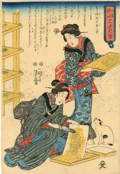 Utagawa Yoshifuji (1828-1887)- Two Women with a Cat. From the series Kaiko yashinai-gusa (Silkworm Cultivation). Circa 1850.