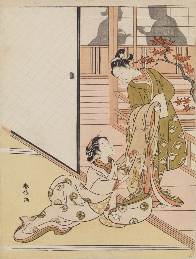 Chuban. 28.6 x 21.4 cm. Waterhouse, The Harunobu Decade, no. 244; Yoshida 298. Fine impression. Very good colour. Fine condition. In addition to the Boston example (Waterhouse, op. cit.) there are impressions in the British Museum and the New York Public Library.