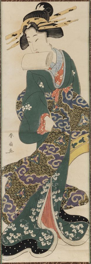 From the series Kayoi kuruwa sakari hakkei (Eight Views of Visits to the Flourishing Pleasure Quarter). Circa 1804. Oban. Ukiyo-e shuka, vol. 3, list no. 315.6. Fine impression. Very good colour and conditon. The courtesan is viewing a page from a volume of the artists celebrated 1804 book, Seiro ehon nenju gyoji (Annals of the Green-houses) with the other volume in front of her. We know of only one other example in ukiyo-e where the written title of a specific book is illustrated within the design of the print. There is another impression in Boston.