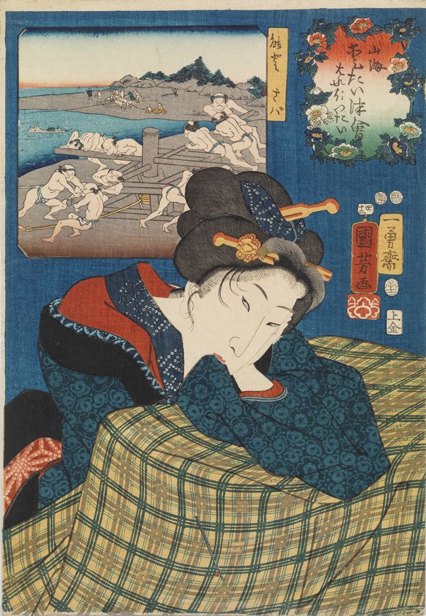 Utagawa Kuniyoshi (1797-1861)- Woman Biting on Her Sleeve and Leaning on a Kotatsu. No. 42, Harebottai (Feeling Swollen); Noto saba (Mackerels from Noto). From the series Sankai medeta zue (Celebrated Treasures of Mountains and Seas). 1852.