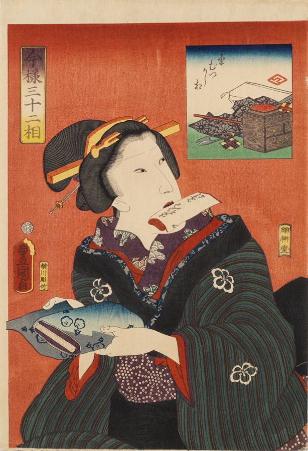 Tsukioka Yoshitoshi (1839-1892)- Looking Delighted: the Appearance of a Present-day Geisha of the MeijiEra (Ureshi-so: Meiji nenkan tokon geigi no fuzoku). From the seriesFuzoku sanjuni-so (Thirty-two Aspects of Customs and Manners). 1888.