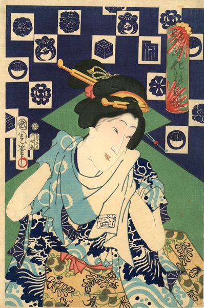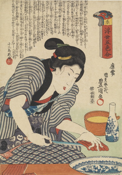 Utagawa Kunisada (1786-1864)- A Seated Beauty Holding a Wrapper. Ningyo-cho. From the series Edo meisho hyakunin bijo (Famous Place of Edo Compared to One Hundred Beautiful Women). 1858.