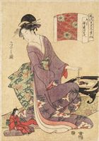 Hosoda Eishi (1756-1829)- A Beauty of the Samurai Class Adjusting Charcoal in a Hibachi with a Doll in the Foreground