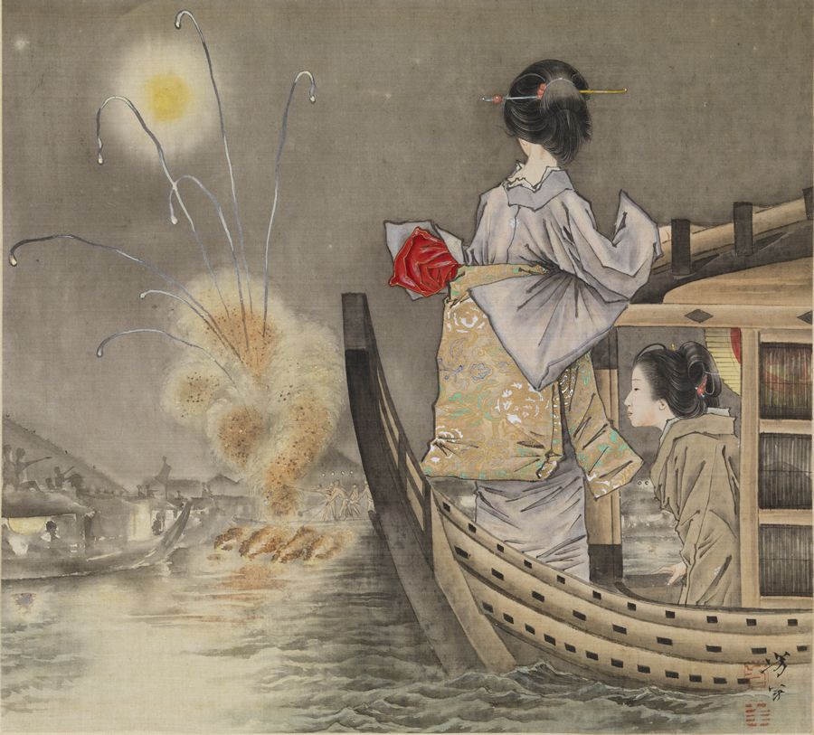Tsukioka Yoshitoshi (1839-1892)- Women in a Boat Watching Summer Fireworks on the Sumida River.